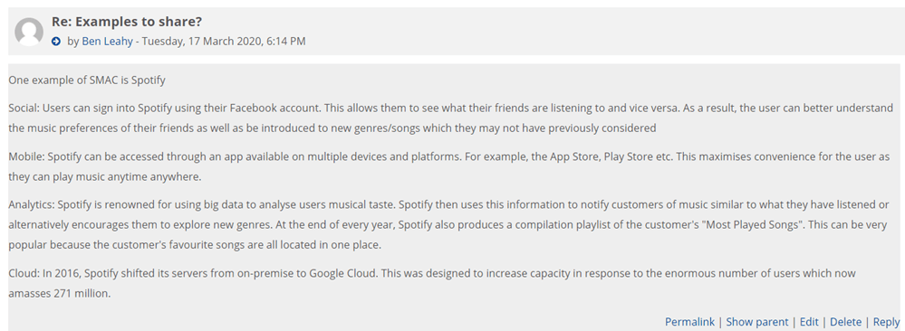 Midway through the term, the module examined the rise of the “sharing” and “circular” economies, new business models, and the impact of digital disruption. From individual study and reviewing comments, I acquired a proper understanding of the theory behind “sharing” and “circular” economies as well as the concomitant fantastic business opportunities. With regards to new business models, I contributed Spotify as a business which makes use of SMAC.