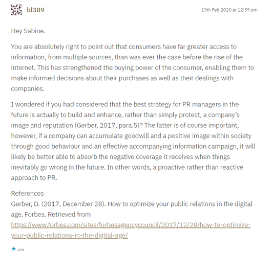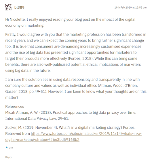 The future of work was also the topic of our first assessed blogpost where we had to assess the impact of the digital economy on a chosen job role. I selected the retail banker. I explored the blogs of my peers and commented on Sabine’s PR & Communications blog as well as Nicolette’s one on Marketing (see below).