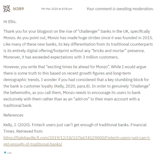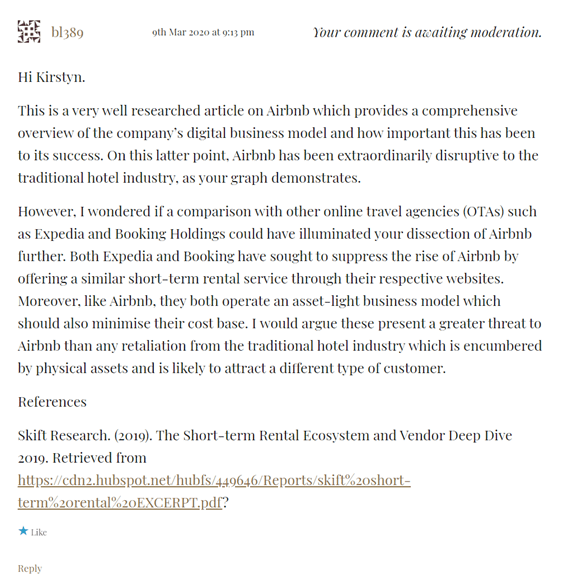 Our second assessed blogpost built on this and required us to critique the digital business model of a chosen company. I opted for Amazon whose business is almost exclusively online and has experienced phenomenal growth as a result. I found Ellis’s blog on “challenger” banks particularly interesting as well as Kirstyn’s on the rise of Airbnb and so, decided to comment on both (see below).